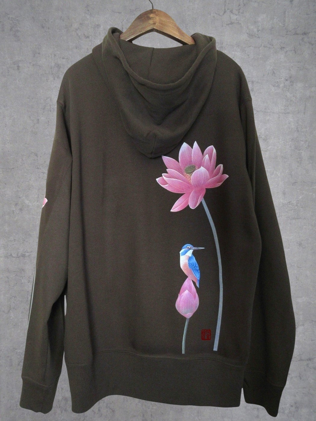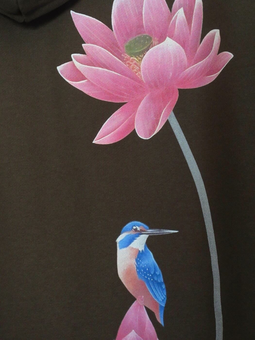人気の蓮の蕾とカワセミの絵をフーディーにプリントしました。