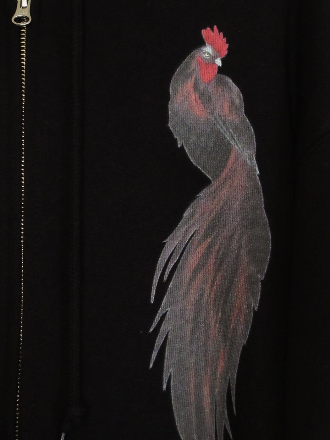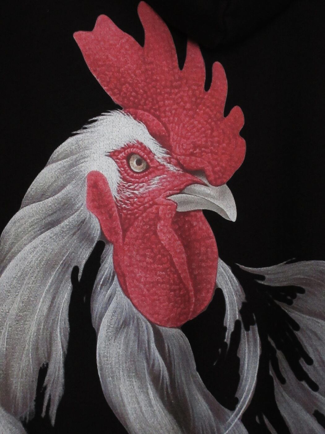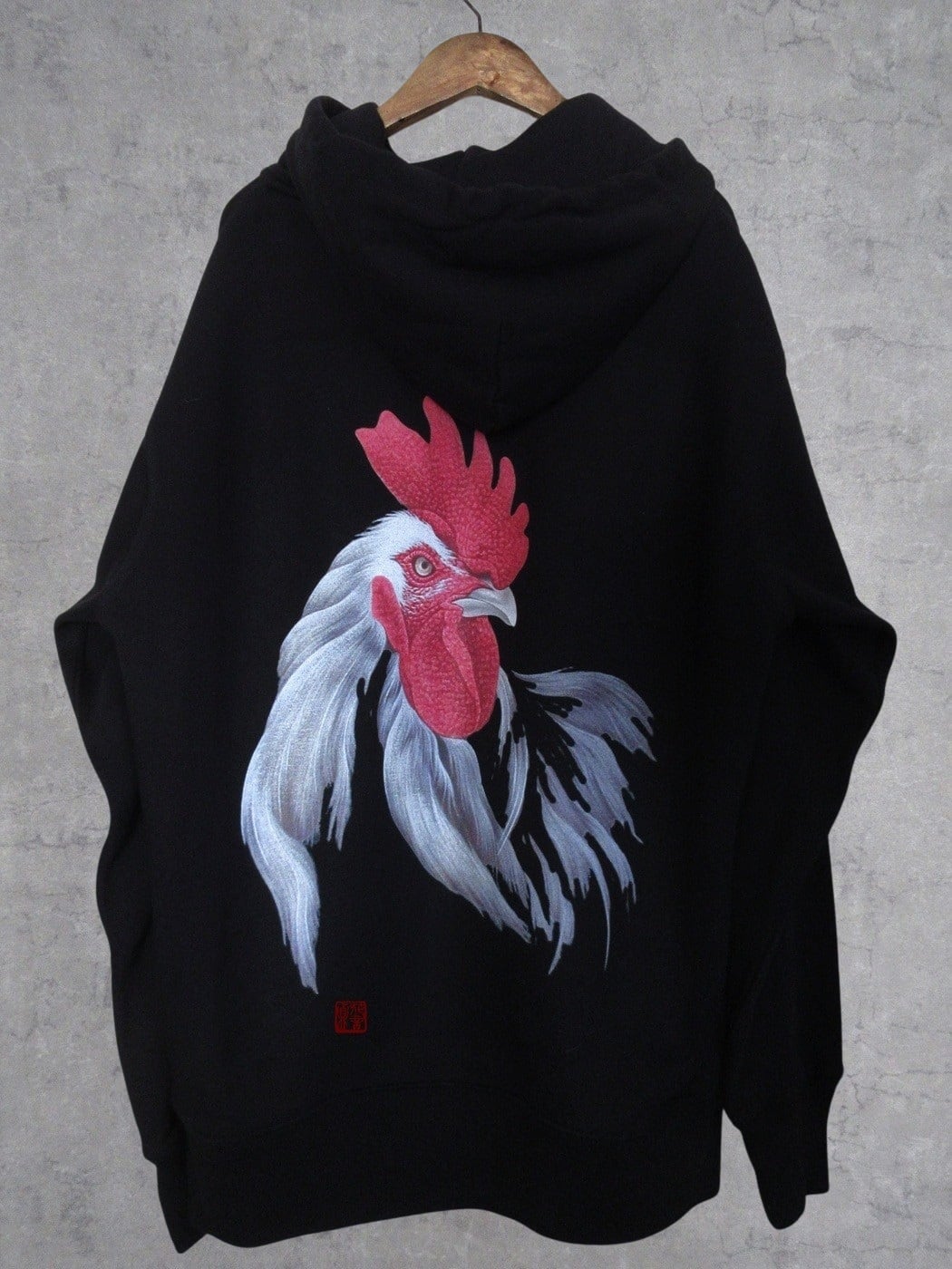 神々しく力強い鶏をイメージして描いた鶏「光明の鳥」をフーディーにプリントしました。