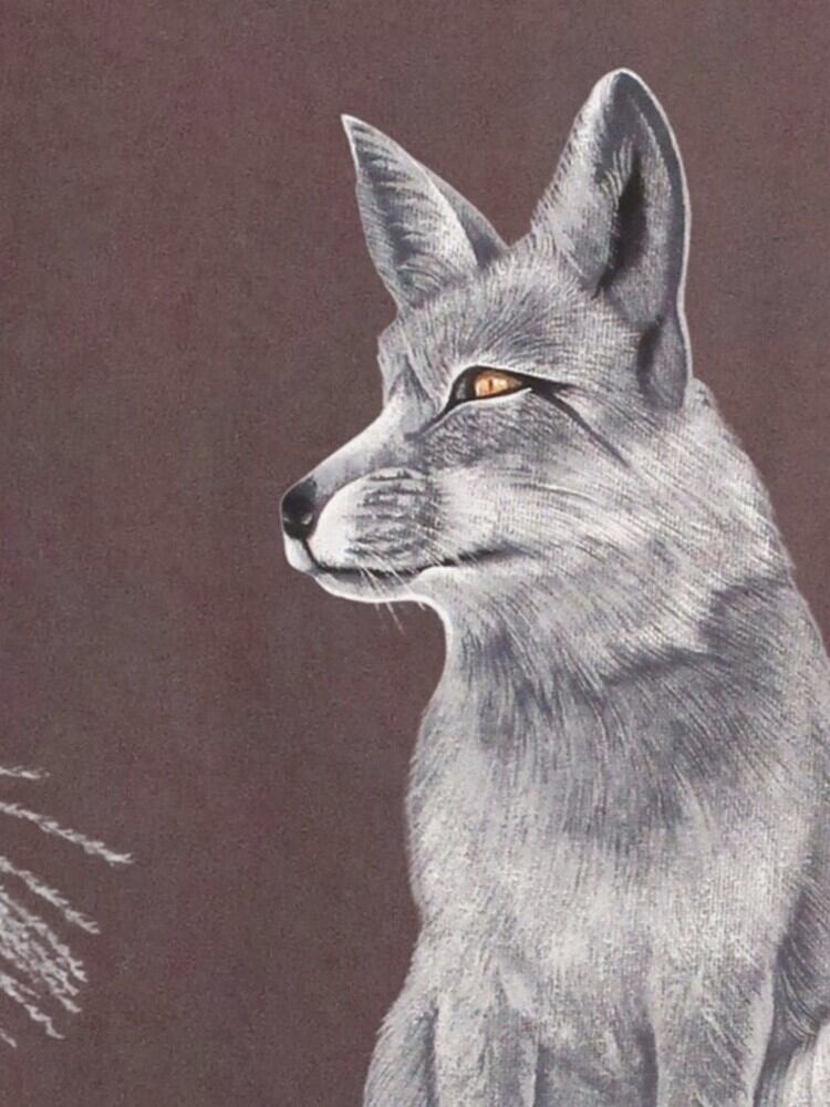 澄んだ夜空の月に照らされる狐とすすきの風景を描いたものをプリントで再現しました。